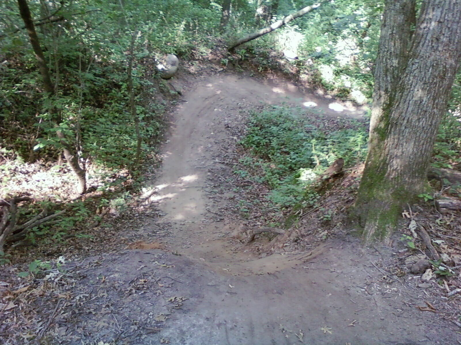 Again we went around and I panicked. "I'm supposed to walk down all the scary parts." These women didn't let up. They told me to back my bike up and try again. They said I could do this. I took another false start. I pointed out the fallen tree that my head might hit when I took the berm (look again at the photo). They assured me I would not hit the tree and mentioned how they had both already done it and neither of them had hit the tree. These ladies were just not buying any of my reasoning and common sense. I took a deep breath and backed my bike up again. I pedaled up to the drop and...